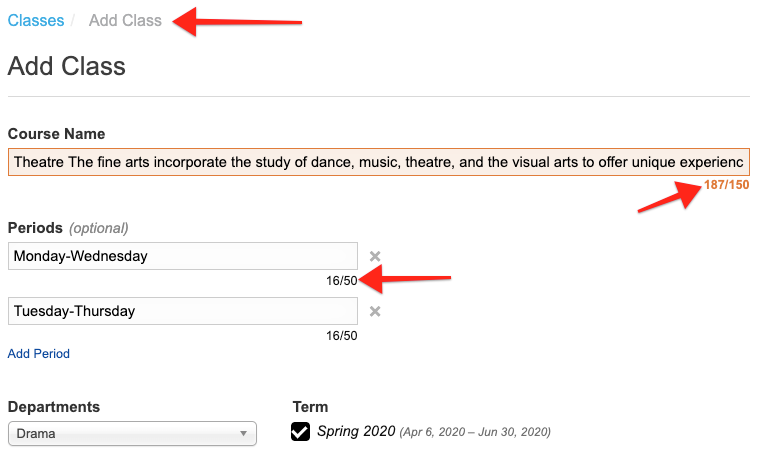 - Character limits on class & period names are now displayed